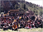 ミンドゥリン寺は、今から100年以上前に、ナンチェン地方の深い谷と山々に囲まれた聖地に建立されました。しかし、文化大革命の時代に破壊され、土壁だけがひっそりと山の斜面に当時の面影をとどめていました。1889年この土地を訪れたTCP統括責任者であるかとうちあきが村人達の寺院再建に対する熱い思いに心を動かされ支援を募り、寺院を再建しました。また仏塔の復興や、地域の交流センターとしてのメディテーションセンターを建設しました。