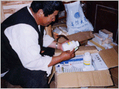 ミンドゥリン・プロジェクトが届けた薬を、ひとつひとつ確認する現地のボランティア医師